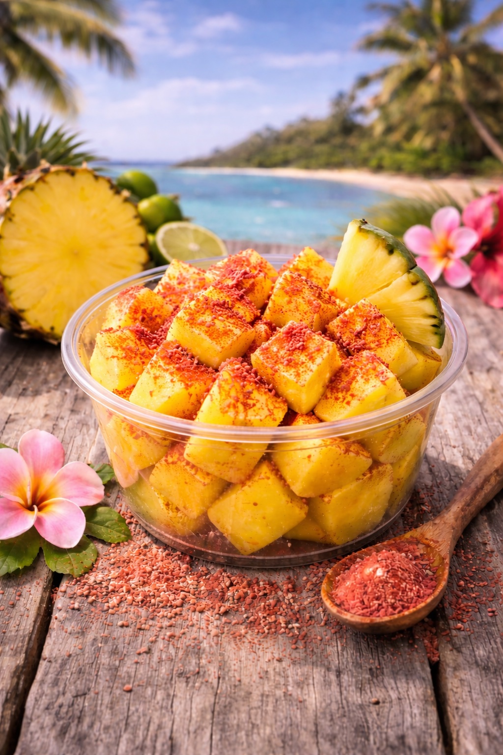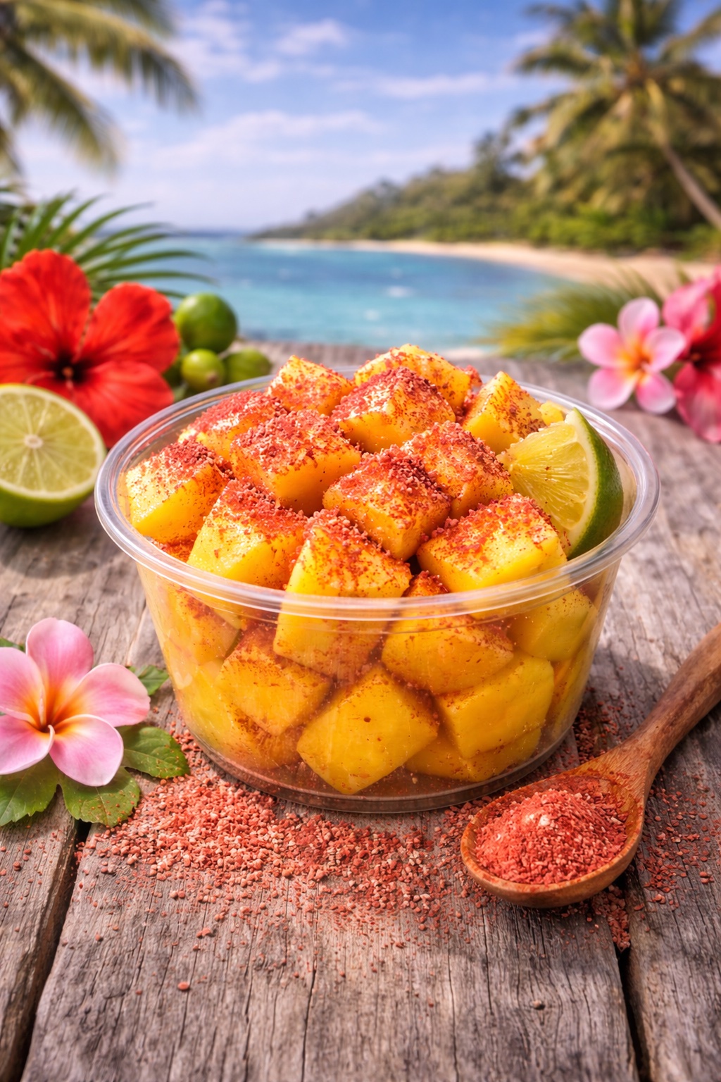 Chilled pineapple chunks dusted with traditional Li Hing plum powder. Bright, juicy, and refreshingly tangy — a true taste of Hawaii's favorite street snack.